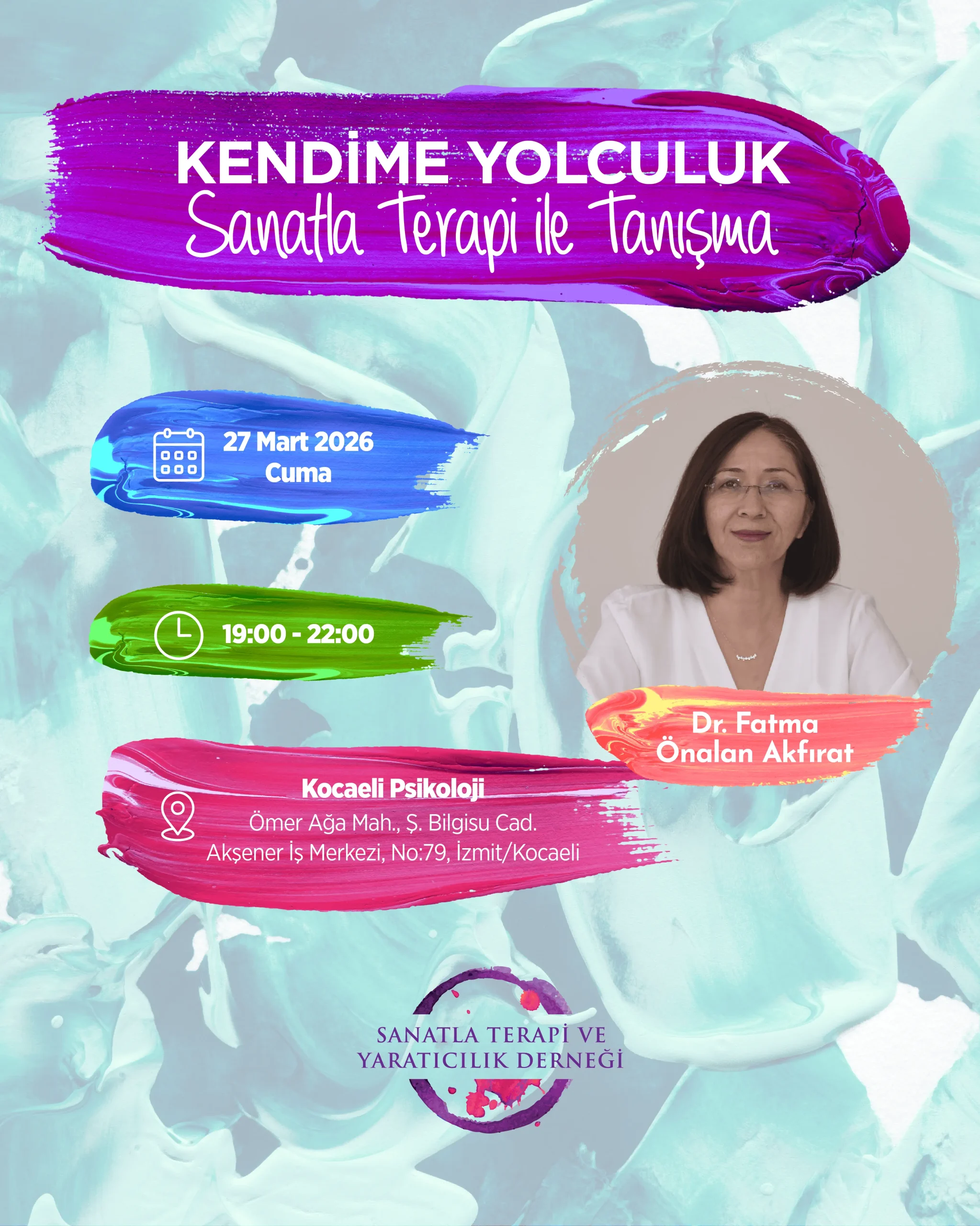 Bu atölye, sanatın iyileştirici ve dönüştürücü gücünü deneyimlemek isteyen yetişkinler içindir. “Kendime Yolculuk” temasıyla tasarlanan bu tanışma çalışmasında katılımcılar; renkler, imgeler ve yaratıcı ifade aracılığıyla iç dünyalarına temas etme fırsatı bulabilirler. Sanatsal beceri gerektirmeyen süreçte amaç güzel bir eser üretmek değil, duyguların ve içsel deneyimlerin sanat yoluyla görünür olmasına alan açmaktır. Deneyimsel süreçte katılımcılar hem kendileriyle hem de grup içinde kurulan bağla yeni farkındalıklar geliştirme imkânı bulacaklar.
